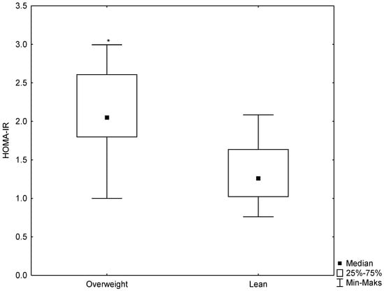 Box-whisker plot for HOMA-IR values in the study groups. * statistically significant difference at p < 0.05.