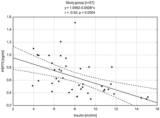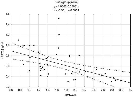 Analyzing the relationships between HSP70 level and concentration of insulin showed that is a negative correlation with the insulin level (r = −0.50; p < 0.0004) and the HOMA-IR (r = −0.50; p < 0.0004) (Figure 4 and Figure 5).