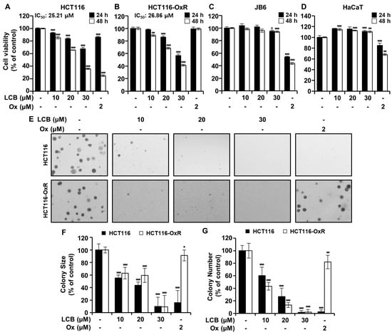 The effects of LCB on HCT116 and HCT116-OxR cell proliferation were determined using an MTT assay. As shown in Figure 1A,B, the viability of HCT116 and HCT116-OxR cells was inhibited by LCB treatment in a dose- and time-dependent manner. Cell viability after treatment with LCB (10–30 μM, 48 h) decreased by between 92.61 and 35.70% for HCT116 cells and 96.78 and 41.51% for HCT116-OxR cells (Figure 1A,B). When exposed to LCB for 48 h, the IC50 values in HCT116 and HCT116-OxR cells were 25.21 µM and 26.86 µM, respectively. As shown in Figure 1A,B, the viability of HCT116-OxR cells was higher than that of HCT116 cells when they were exposed to an equal concentration of Ox. These results indicate that the HCT116-OxR cell line was resistant to Ox. In addition, LCB did not affect the viability of JB6 or HaCaT cells (Figure 1C,D). A soft agar assay was used to assess the ability to survive in an anchorage-independent manner after treatment with LCB. Figure 1E–G show that LCB treatment significantly reduced anchorage-independent survival and proliferation of HCT116 and HCT116-OxR cells in vitro, and decreased colony size (Figure 1F) and numbers (Figure 1G) in a concentration-dependent manner. When exposed to Ox, the colonies formed by HCT116 cells were smaller and fewer than those formed by HCT116-OxR cells. These findings indicate that LCB inhibited cell viability and anchorage-independent growth in Ox-sensitive and -resistant CRC cells.