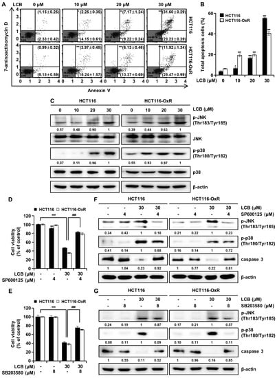 LCB induces apoptosis and causes phosphorylation of JNK/p38 MAPK in human CRC cells. Cells were treated with LCB at 0, 10, 20, and 30 μM for 48 h. (A) Annexin V/7-aminoactinomycin D (7-AAD) flow cytometry analysis of CRC cells. Early and late apoptotic cells are represented in the lower right quadrant (Annexin-V-positive and 7-AAD-negative) and upper right quadrant (Annexin-V-positive and 7-AAD-positive), respectively. (B) Percentages of early and late apoptotic cells after LCB treatment of CRC cells. (C) Western blot showing the expression levels of p-JNK, JNK, p-p38, and p38 in CRC cells. β-actin served as a housekeeping protein. (D,E) MTT assay was performed to determine the effects of SP600125 (JNK inhibitor) and SB203580 (p38 MAPK inhibitor) on the viability of CRC cells. (F,G) HCT116 and HCT116-OxR cells were pre-treated with SP600125 (4 μM) or SB203580 (8 μM) for 3 h and then treated with LCB (30 μM) for an additional 48 h. The expression of p-JNK, p-p38, and caspase 3 was examined by Western blot analysis. Results are expressed as the mean ± SD. * p < 0.05, ** p < 0.01, *** p < 0.001 compared with the control group. ### p < 0.001 compared with the LCB-alone-treated group.
