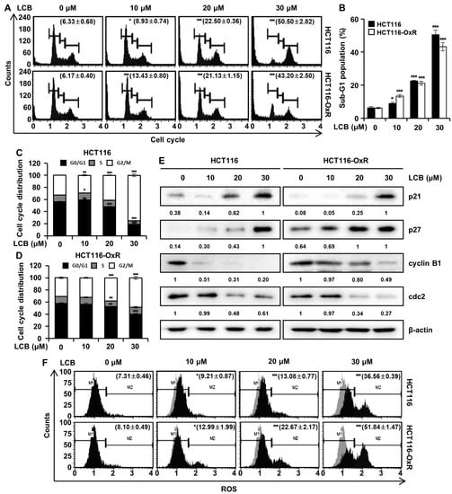 The effect of LCB on the cell cycle was determined to elucidate the mechanism of action of LCB in CRC cells. As shown in Figure 3A,B, following treatment with 0, 10, 20, and 30 μM LCB, the percentages of the sub-G1 phase in HCT116 cells were 6.13 ± 0.23%, 8.67 ± 0.49%, 14.93 ± 1.21%, and 36.47 ± 2.60%, and those in HCT116-OxR cells were 6.17 ± 0.40%, 13.43 ± 0.80%, 21.13 ± 1.15%, and 43.20 ± 2.50%, respectively. The proportion of G2/M cells increased in a dose-dependent manner in HCT116 and HCT116-OxR cells, indicating that LCB induced G2/M phase arrest (Figure 3C,D). Further, the percentage of HCT116 cells in the G2/M phase increased from 30.50% (control) to 35.57% (LCB 30 μM) (Figure 3C), while that of HCT116-OxR cells increased from 30.73% (control) to 48.50% (LCB 30 μM) (Figure 3D). To further investigate the effect of LCB on the cell cycle distribution, we examined cell-cycle-related protein expression by Western blotting. Figure 3E shows that LCB upregulated the expression levels of p21 and p27 but downregulated cyclin B1 and cdc2. Increased intracellular levels of ROS can lead to the apoptosis of cancer cells []. Therefore, we examined the intracellular levels of ROS after LCB treatment using the Muse® Oxidative Stress Kit. ROS levels were increased by 7.31 ± 0.46% (0 μM), 9.21 ± 0.87% (10 μM), 13.08 ± 0.77% (20 μM), and 36.56 ± 0.39% (30 μM) in HCT116 cells and by 8.10 ± 0.49% (0 μM), 12.99 ± 1.99% (10 μM), 22.67 ± 2.17% (20 μM), and 51.84 ± 1.47% (30 μM) in HCT116-OxR cells (Figure 3F). These results demonstrate that LCB induces G2/M phase arrest, which is accompanied by a change in the expression of G2/M-phase-related proteins and upregulates the cellular generation of ROS in CRC cells.