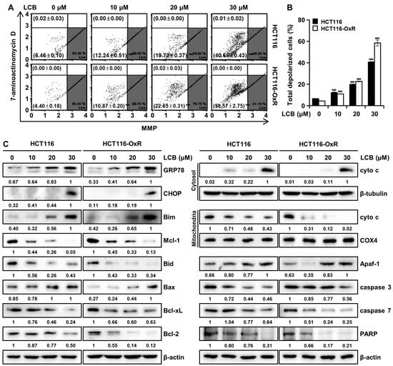 LCB induces apoptosis in CRC cells by disturbing the mitochondrial membrane potential (MMP) and regulating endoplasmic reticulum (ER) stress and apoptosis-related proteins. Cells were treated with 0, 10, 20, and 30 μM LCB for 48 h. (A,B) Flow cytometry analysis of MMP using the Muse® MitoPotential Kit. *** p < 0.001 versus the control group. (C) Western blot analysis of ER-stress- and apoptosis-related proteins in CRC cells. Effect of LCB on the expression of GRP78, CHOP, Bim, Mcl-1, Bid, Bax, Bcl-xL, Bcl-2, cytochrome c (cyto c), β-tubulin, COX4, Apaf-1, caspase 3, caspase 7, and PARP proteins. β-tubulin, COX4, and β-actin were used as internal controls. Protein bands were quantified using Image J software.