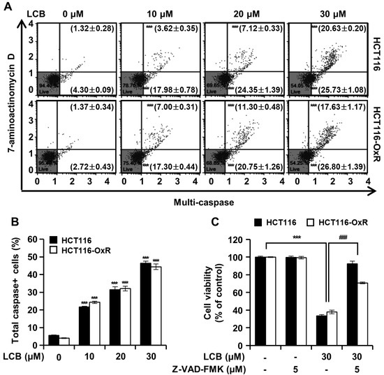 LCB treatment (30 μM) increased the percentage of HCT116 and HCT116-OxR (40.72% and 40.35%, respectively) cells with multi-caspase activation (Figure 5A,B) when compared to that in the corresponding DMSO control. To determine whether LCB-induced apoptosis is dependent on caspase activity, HCT116 and HCT116-OxR cells were incubated with 30 μM LCB in the presence or absence of Z-VAD-FMK, a pan-caspase inhibitor. As shown in Figure 5C, compared with the control group, 30 µM LCB decreased HCT116 and HCT116-OxR cell viability by 66.64 and 62.03%, respectively, while the viability of cells treated with Z-VAD-FMK and LCB only reduced by 7.54 and 26.27%, respectively, compared with that in the control group.
