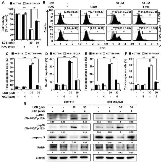 Pretreatment of HCT116 and HCT116-OxR cells with the ROS inhibitor (NAC, 4 mM) for 3 h, followed by exposure to LCB (30 μM) for 48 h, significantly increased cell viability in both cell lines compared to cells treated with LCB only (Figure 6A). Further, the aforementioned procedure was used to determine if LCB-induced ROS may play a role in apoptosis, cell cycle arrest, MMP depolarization, or caspase activation. ROS accumulation was detected in CRC cells after LCB treatment but was abrogated when cells were pretreated with NAC, confirming the effective elimination of LCB-induced ROS production by NAC (Figure 6B). The apoptotic effect was reversed by the addition of NAC, which reduced the apoptotic rate caused by LCB from 54.17 ± 0.33% to 8.82 ± 0.73% in HCT116 cells and 58.80 ± 3.26% to 7.05 ± 0.53% in HCT116-OxR cells (Figure 6C). NAC pretreatment of HCT116 and HCT116-OxR cells inhibited the effects of LCB-induced apoptosis, including the prevention of cell cycle arrest, MMP loss, and multi-caspase activity. ROS have been reported to regulate MAPK signaling [], and to confirm this, protein expression was examined through a Western blot assay after pretreatment with NAC. The increase in p-JNK and p-p38, as well as the reduction in PARP and caspase 3 levels following LCB treatment, was reversed in the presence of NAC, an ROS scavenger (Figure 6G). As expected, the increase in JNK and p38 MAPK phosphorylation in HCT116 and HCT116-OxR cells was reversed by NAC treatment. These data suggest that LCB induces ROS generation in CRC cells, which, in turn, activates JNK/p38 signaling and induces apoptosis.