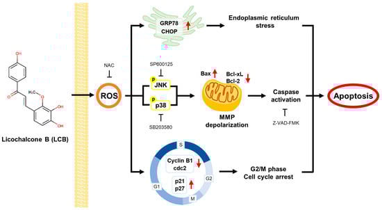 Progression through the various stages of the cell cycle is regulated by a series of related proteins, cyclins, cyclin-dependent kinases (CDK), and CDK inhibitors [,]. Cyclin B expression is a prerequisite for progression from G2 to M and interacts with CDK1 to induce mitosis []. Cip/Kip family members, which are CDK inhibitors containing p21Cip, p27Kip, and p57Kip, share a conserved N-terminal domain that binds to cyclins and CDKs []. p21Cip and p27Kip are triggered by antimitotic signals or DNA damage and bind to cyclin-CDK complexes to inhibit their catalytic activity and induce cell cycle arrest []. Our results suggest that LCB caused cell cycle arrest at the G2/M stage by decreasing the protein levels of cyclin B1 and cdc2 and increasing the protein levels of p21 and p27 (Figure 3). Elevated ROS levels in cancer cells cause oxidative stress, leading to DNA damage and cell cycle arrest []. After pretreatment with the ROS inhibitor, NAC, the sub-G1 phase cell ratio decreased (Figure 6D). This result confirmed that LCB induced sub-G1 cell population and G2/M cell cycle arrest via an ROS-mediated pathway.