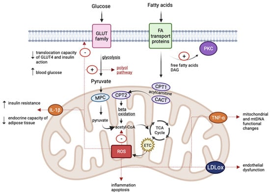Hyperglycaemia and T2DM are directly linked to mitochondrial activity, function, and oxidative stress. Mitochondria produce the largest amount of ROS and ATP. With regards to hyperglycaemic status, the amount of ROS increases and triggers changes in cellular homeostasis with the generation of lesions at this level [87]. The increased production of O2•− affects the translocation capacity of glucose transporter 4 (GLUT4) from the intracellular level to the plasma membrane, resulting in a decrease in insulin action at the tissue level and an increase in blood glucose amount [70,71]. Hyperglycaemia generates an excessive production of ROS which favours the appearance of mitochondrial changes and stimulates the polyol pathway, glucose autoxidation, and an increase in advanced glycosylation end products in diabetic patients [23,88]. Changes at the OXPHOS level, a reduction in NADH oxidoreductase, and citrate synthase activity induce insulin resistance [89]. Fatty acid catabolism, a mechanism called beta-oxidation, is also carried out at the mitochondrial level. The reduction in fatty acid oxidation, together with the accumulation of lipids and diacylglycerol, drive both the activation of protein kinase C and increased ROS production. Thus, there are changes in the mitochondrial functioning mechanism that affect ATP synthesis. A compromise of mitochondrial function causes a lipid excess and the development of insulin resistance [89,90]. The amplification of oxidative stress generates and maintains inflammation, causes lipid peroxidation, and initiates changes in the insulin signalling mechanism. Insulin resistance generated by hyperlipidaemia induces changes in mtDNA and proteins [70].