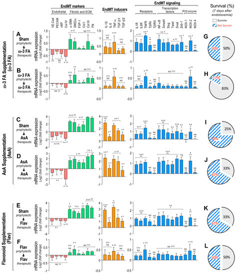 Impact on EndMT gene expression through dietary supplementation based on ω–3 FA, ascorbic acid, or polyphenolic antioxidant flavonoids in endotoxemic rats. (A–D) The mRNA expression of EndMT markers (endothelial markers (red bars) and fibrotic and ECM markers (green bars)), EndMT inducers (orange bars) and EndMT signaling (blue bars) were detected in rats subjected to endotoxemia and supplemented with ω–3 fatty acid (ω-3 FA, (A,B)), ascorbic acid (AsA, (C,D)), or polyphenolic antioxidant flavonoids (Flav, (E,F)) through a therapeutic (A,C,E) and a prophylactic (B,D,F) protocol. (G–L) Survival percentage was determined 7 days after endotoxemia induction in rats subjected to endotoxemia and supplemented with ω–3 fatty acid (ω–3 F (G,H)), ascorbic acid (AsA, (I,J)), or polyphenolic antioxidant flavonoids (Flav, (K,L)) through a therapeutic (G,I,K) and a prophylactic (H,J,L) protocol. Statistical differences were assessed by a one-way analysis of variance (ANOVA) (Kruskal–Wallis) followed by Dunn’s post hoc test. * p < 0.05, ** p < 0.01, *** p < 0.001 compared with the saline-treated condition. † p < 0.05, †† p < 0.01, ††† p < 0.001 compared with the mRNA-expression values from endotoxemia-treated rats shown in Figure 1B. NS: non-significant. Determination of mRNA expression was normalized relative to 28S mRNA and are expressed relative to sham-supplemented condition. Values are expressed as the mean ± SD. (N = 12).