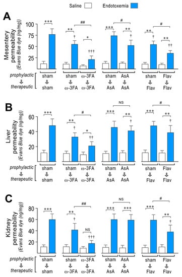 Effects in vascular hyperpermeability through dietary supplementation based on ω-3 FA, ascorbic acid, or polyphenolic antioxidant flavonoids in endotoxemic rats. After saline (open bars) and endotoxemia (blue bars) treatments that were supplemented with water (sham), ω-3 fatty acid (ω-3 FA), ascorbic acid (AsA), or polyphenolic antioxidant flavonoids (Flav), through a therapeutic and a prophylactic protocol, the mesentery (A), kidney (B), and liver (C) were harvested and processed for EBD extraction to determine blood vessel hyperpermeability. EBD content was normalized to total sample weight. Statistical differences were assessed by two-way ANOVA followed by Dunnett’s post hoc test. * p < 0.05; ** p < 0.01; *** p < 0.001 comparing saline and endotoxemia condition. † p < 0.05, †† p < 0.01, ††† p < 0.001 compared with sham-treated condition. # p < 0.05; ## p < 0.01 comparing non-survivor endotoxic condition between therapeutic and prophylactic protocol. NS: non-significant. Results are expressed as the mean ± SD (N = 12).