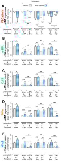 Interestingly, higher changes in mRNA expression of VE-Cad, α-SMA, Col III, TNF-α, and NF-κB were found mainly in the non-surviving endotoxemic rats compared to survivors, as observed in the sham group (Figure 4A–E, left panel, respectively). The ω-3 fatty acid-supplemented endotoxemic rats had decreased hyperpermeability values in both the therapeutic and prophylactic protocols in non-survivors and survivors, compared to the corresponding condition in the sham group, showing higher changes in mRNA expression in the non-surviving ω-3 fatty acid-supplemented endotoxemic rats compared to survivors (Figure 4A–E, middle left panel). However, AsA-supplemented endotoxemic rats showed, to a major extent, non-significant differences in mRNA expression changes between non-surviving and surviving rats (Figure 4A–E, middle right panel). The flavonoid-supplemented endotoxemic rats showed higher changes in mRNA expression in the non-surviving rats subjected to the prophylactic protocol, whereas in the therapeutic protocol, non-significant differences were observed (Figure 4A–E, right panel).