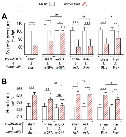 Effects in systolic blood pressure and cardiac frequency through dietary supplementation based on ω-3 FA, ascorbic acid, or polyphenolic antioxidant flavonoids in endotoxemic rats. After saline (open bars) and endotoxemia (dashed bars) treatments that were supplemented with water (sham), ω-3 fatty acid (ω-3 FA), ascorbic acid (AsA), or polyphenolic antioxidant flavonoids (Flav), through a therapeutic and a prophylactic protocol, the systolic blood pressure (A) and cardiac frequency (B) were determined. Statistical differences were assessed by two-way ANOVA followed by Dunnett’s post hoc test. * p < 0.05; ** p < 0.01; *** p < 0.001 comparing saline and endotoxemia condition. † p < 0.05, ††† p < 0.001 compared with sham-treated condition. # p < 0.05; ## p < 0.01 comparing non-survivor endotoxic condition between therapeutic and prophylactic protocol. NS: non-significant. Results are expressed as the mean ± SD (N = 12).