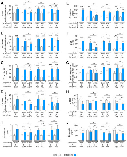 Effects in MODS through dietary supplementation based on ω-3 FA, ascorbic acid, or polyphenolic antioxidant flavonoids in endotoxemic rats. After saline (open bars) and endotoxemia (blue bars) treatments that were supplemented with water (sham), ω-3 fatty acid (ω-3 FA), ascorbic acid (AsA), or polyphenolic antioxidant flavonoids (Flav), through a therapeutic and a prophylactic protocol, the blood levels of the liver dysfunction markers alanine aminotransferase (ALT, (A)), aspartate aminotransferase (AST, (B)), total bilirubin (TBIL, (C)), and gamma-glutamyl transferase (GGT, (D)); renal dysfunction markers creatinine (CRE, (E)) and blood urea nitrogen (BUN, (F)); BUN/Creatinine ratio (G); estimated GFR (eGFR, (H)); and the metabolic dysfunction markers lactic acid (LAC, (I)) and glycemia (GLY, (J)) were measured. Statistical differences were assessed by two-way ANOVA followed by Dunnett’s post hoc test. * p < 0.05; ** p < 0.01; *** p < 0.001 comparing saline and endotoxemia condition. † p < 0.05, †† p < 0.01, ††† p < 0.001 compared with sham-treated condition. # p < 0.05; ## p < 0.01; ### p < 0.001 comparing non-survivor endotoxic condition between therapeutic and prophylactic protocol. NS: non-significant. Results are expressed as the mean ± SD (N = 12).