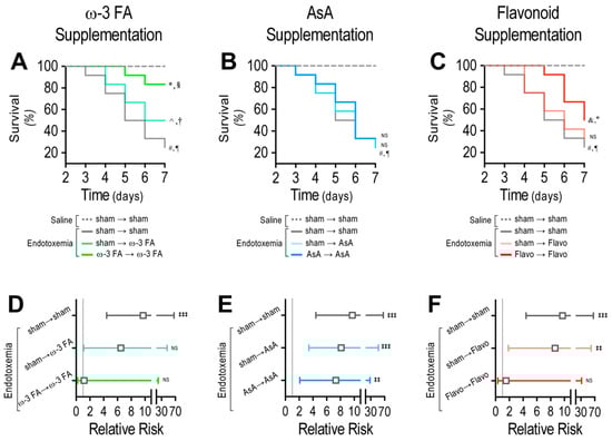 Survival and risk of death through dietary ω-3 FA, ascorbic acid, or polyphenolic antioxidant flavonoid supplementation in endotoxemic rats. Survival (Kaplan–Meier) curves comparing ω-3 FA (A), ascorbic acid (B), or polyphenolic antioxidant flavonoid (C) supplementation in saline- and endotoxemia-treated rats, through a therapeutic and a prophylactic protocol. *, § = 0.01 and 0.03 (log-rank (Mantel–Cox) test and Gehan–Breslow–Wilcoxon test, respectively) when comparing with endotoxemia-treated condition. ^, † = 0.004 and 0.007 (log-rank (Mantel–Cox) test and Gehan–Breslow–Wilcoxon test, respectively), when comparing with endotoxemia-treated condition. #, ¶ = 0.005 and 0.009 (log-rank (Mantel–Cox) test and Gehan–Breslow–Wilcoxon test, respectively), when comparing with saline-treated condition. &, ° = 0.004 and 0.007 (log-rank (Mantel–Cox) test and Gehan–Breslow–Wilcoxon test, respectively), when comparing with endotoxemia-treated condition. NS: non-significant (N = 12). Contingency analyses performed to determine relative risk in endotoxemic rats supplemented with ω-3 FA (D), ascorbic acid (E), or polyphenolic antioxidant flavonoids (F) in endotoxemia-treated rats, through a therapeutic and a prophylactic protocol. ‡‡ p < 0.01; ‡‡‡ p < 0.001 (Fisher’s exact test) compared to saline-treated condition. Results are expressed as the mean ± 95% confidence interval (CI) NS: non-significant (N = 12).