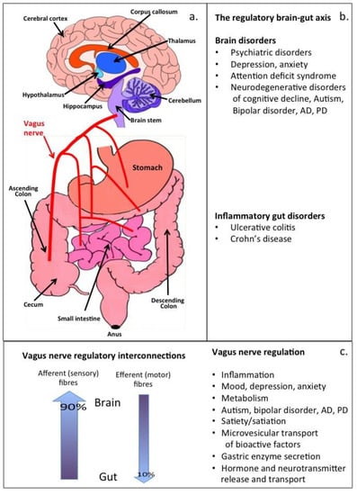 The vagus nerve is the longest and most complex of the 12 cranial nerves in the human body and a major component of the parasympathetic nervous system. It provides autonomic control and functional regulation of internal organs, controlling such fundamental processes as digestion, the pulsatile behaviour of the heart (which controls blood circulation), and the behavior of the muscle systems that control the respiratory system [1,2,3]. The autonomic nervous system also controls reflex actions, such as coughing, sneezing, and swallowing, and coordinates with the sympathetic nervous system to achieve organ homeostasis. The vagus nerve has important roles as a line of communication between the gut microbiome and linked organ systems [4]. In infancy, the microbiome contributes to the education of the immune system by exposing it to a range of epitopes, leading to a diverse recognition system that can identify self- from non-self-preventing sensitivities to food epitopes in adulthood, and also to the development of auto-immune disorders and life-threatening allergies [5]. The microbiota, gut, and brain communicate through the vagus nerve In a bidirectional communication system in what has been termed the gut-brain axis (Figure 1) [5]. The vagus nerve is a mixed nerve containing 80% afferent and 20% efferent fibres that deliver important instructive information in the form of vesicular neurotransmitters using a sophisticated transport system [6]. Activated nerves transport neurotransmitters to the synaptic gap where neurotransmitters release transducer signals and motor functions mediated by neural networks. Bioactive compounds are transported to the brain by efferent vagal fibres to stimulate specific brain regions. Vagal stimulation has been used to treat neuropsychiatric disorders [7].