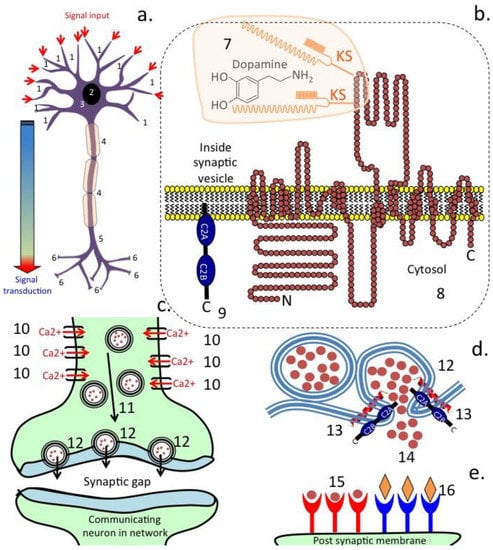 Schematic of neural signal transduction. Depiction of a neuron and its functional components (a) and the processes that occurs when a nerve is activated and signal transduction occurs (b–e). Specific features of the neuron are annotated, including the neural dendrite processes (1) where signal input occurs, the nucleus (2), which regulates neural activity in the neural cell body or soma (3). The myelinated sheath (4) covering the axon (5) ensures neural signal transmission efficiency is maintained. Neural synapses (6) communicate with other neurons in the neural network. Neural transmitters, such as dopamine (7), are stored in a smart gel matrix within the synaptic vesicle supplied by a 12 span transmembrane KS-storage and transport proteoglycan, SV-2 (8). The synaptic vesicle also has a calcium sensing glycoprotein: synaptotagmin (9). When a nerve becomes activated, the cell membrane becomes depolarized in the soma and a wave of membrane depolarization travels down the axon to the synapses. An influx of Ca2+ (10) into the nerve cytosol occurs in neuronal activation; this increase in Ca2+ is detected by synaptotagmin, which mobilises the transport of synaptic vesicles to the synaptic gap by SV-2 (11), and the synaptic vesicles fuse with the de-polarised pre-synaptic membrane (12). This fusion process is regulated by synaptotagmin and SNARE complex (SNAP Receptor) proteins and the neurotransmitters are released into the synaptic gap (14) to be taken up by neurotransmitter receptors on a communicating neuron in the network and the signal is successfully transduced. This is an extremely rapid process occurring in ~50–60 milliseconds.