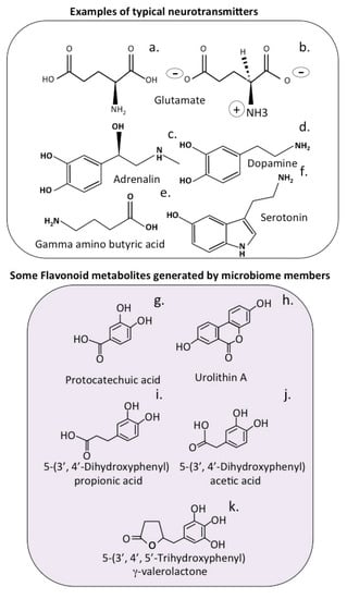 Neurotransmitters and flavonoid metabolites. A comparison of the structure of neurotransmitters (a–f) conveyed by nerves by vesicular transport, as shown in Figure 2. A few selected flavonoid metabolites generated by the gut microbiome are also shown for comparison (g–k). These flavonoid metabolites display a range of activities against neurons and cerebrovascular endothelial cells, and have beneficial properties that combat neuroinflammation, are neuroprotective, and have vasodilatory properties that promote cerebral blood flow in neurological disorders. Some of these metabolites have also been shown to promote mitochondrial biogenesis, improving neural bioenergetics and neuronal function in disorders, such as AD and PD, where a cognitive decline has been observed.
