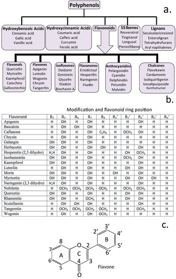 The flavonoids. Classification of the flavonoids, a major sub-category of phenolic compounds (a), showing the diverse modifications (b) that occur on the A, B and C flavone ring structures (c).