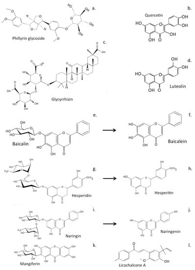 Examples of the varied ring structures of some of the flavonoids covered in this review. Structures of bioactive phenolic compounds identified in Chaihu-Shugan-San, Qingfei Paidu, and Ma Xing Shi Gan traditional Chinese complimentary medical formulations. Identification of phillyrin glycoside, quercetin, glycyrrhizic acid, luteolin, baicalin, baicalein, hesperidin, hesperitin, naringin, naringenin mangiferin, and licochalcone A (a–l) as bioactive components of such herbal formulations.
