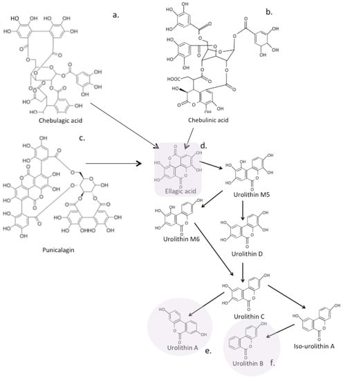 Generation of Urolithins: complex heterocyclic elligatannin compounds, such as chebulagic acid (a), chebulinic acid (b), and punicalagin (c) occurring in plant foods are converted to ellagic acid (d) and a number of urolithin metabolites by the gut microbiome. Urolithin A (e) and B (f) are active in neural tissues.