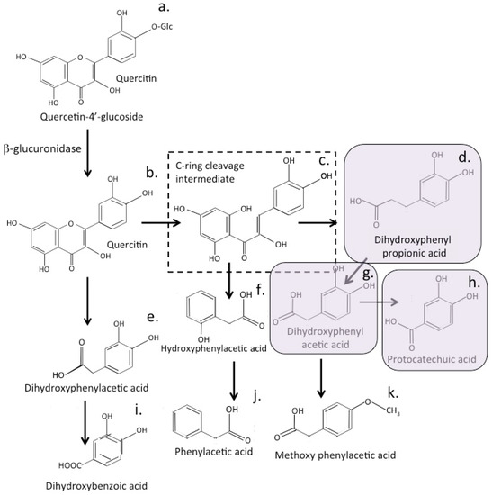 The gut microbiome members Escherichia coli, Streptococcus lutetiensis, Lactobacillus acidophilus, Weissella confusa, Enterococcus gilvus, Clostridium perfringens and Bacteroides fragilis have all been shown to degrade quercetin into a number of metabolites with C. perfringens and B. fragilis having the strongest degradative capability in vitro [324]. Peng et al. also demonstrated the presence of 3,4-dihydroxyphenylacetic acid production by C. perfringens and B. fragilis demonstrating their quercetin degradative capacity [325]. Fecal gut bacteria also degrade rutin as a substrate in-vitro releasing 3,4-dihydroxyphenylacetic acid as a metabolite [326].