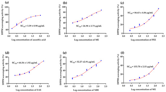 The scavenging effects of T. grandis methanolic extract and fractions on DPPH free radicals. (a) Log concentration–scavenging rate fitting curve of ascorbic acid. (b) Log concentration–scavenging rate fitting curve of ME. (c) Log concentration–scavenging rate fitting curve of PEE. (d) Log concentration–scavenging rate fitting curve of EAE. (e) Log concentration–scavenging rate fitting curve of NBE. (f) Log concentration–scavenging rate fitting curve of WF. All values are mean ± SD from three independent experiments. ME: methanolic extract, PEE: petroleum ether extract, EAE: EtOAc extract, NBE: n-BuOH extract and WE: water extract.