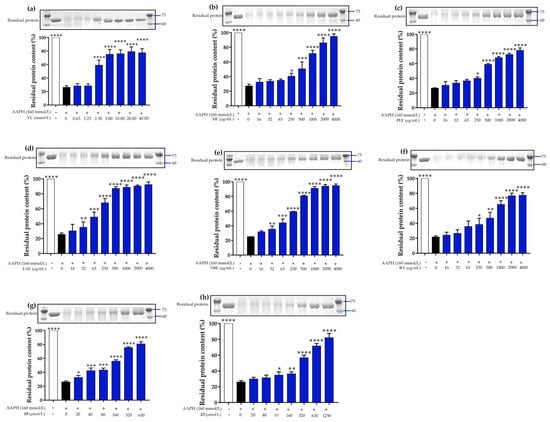 The literature reports that AAPH is a free radical generator that can generate alkoxy and alkylperoxy radicals, thereby inducing oxidative damage to macromolecules [64]. Protein degradation and the formation of protein carbonyl groups are the main characteristics of protein oxidation [65,66]. Studies have found that many diseases, such as Alzheimer′s disease, diabetes, cardiovascular and cerebrovascular diseases, are associated with increased protein carbonylation levels [67]. As shown in Figure 4, compared with the control group without AAPH, BSA was induced by AAPH, the BSA bands were noticeably shallower and the carbonylation level of BSA was increased, indicating that hydroxyl free radicals produced by the AAPH induced system can significantly degrade and carbonize BSA. In this experiment, the content of residual protein was used to reflect the abilities of samples to prevent protein oxidative damage.