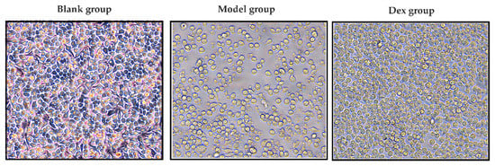 Next, differentiated 3T3-L1 adipocytes at a density of 5 × 104 cells/well were cultured with DMEM in 96-well plates and divided into the blank control group, model group, insulin group (100 ng/mL), berberine group (10 μg/mL) and compound groups (40 μM). Then, 10 μL samples were mixed with 190 μL medium and added to individual 3T3-L1 adipocytes. This was repeated 3 times. After 24 and 48 h of culture, glucose uptake was initiated by the addition of 10 μM medium and 190 μL glucose detection reagent to each well, reaction at 37 °C for 15 min, and the glucose uptake was measured according to the operating instructions of the glucose content determination kit. Following the glucose uptake test, cell viability was detected by CellTiter96® Aqueous One Solution Cell Proliferation Assay. Then, 20 μL/well CellTiter96® Aqueous One Solution Cell Growth Assay reagent was added to the plate and incubated at 37 °C for 8 h. Absorbance was measured at 490 nm and relative cell viability was calculated according to Equation (7).