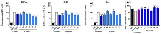 LPS is widely used as a stimulator to activate macrophages, inducing the release of pro-inflammatory mediators from macrophages, in particular TNF-α, interleukins (IL-1β, IL-6), NO and ROS [68]. It is involved in various pathological processes of acute and chronic inflammation. The levels of TNF-α, IL-1β and IL-6 in macrophage culture supernatants were measured using an ELISA kit, and then the anti-inflammatory effects of compounds 1, 12, 13, 15, 18 and 23 on LPS-stimulated macrophages were studied. Compared with blank control cells, pro-inflammatory cytokines were increased in the model and positive groups (Dexamethasone) stimulated by LPS (Figure 5). As seen in Figure 6a, compounds 1, 18 and 23 could decrease TNF-α inflammatory factors levels at 40 µM when compared to the model controls (p < 0.01). Meanwhile, in Figure 6b, compounds 1, 13, 18 and 23 produced a significant decrease in IL-1β inflammatory factors levels at 40 µM (p < 0.0001). As shown in Figure 6c, compounds 1, 13 and 18 showed significant activities in reducing the expression of IL-6 inflammatory factors at 40 µM (p < 0.05). The anti-inflammatory activity of compound 1 might be related to the fact that the flavonoid was connected by two benzene rings (A and B) through an oxygen-containing heterocycle (C), and with the glycosylation mode on the A ring [69]. Compound 13 has significant anti-inflammatory activity, which was consistent with the literature [4]. The activity of compound 18 might be related to its structure, which is composed of six isoprene and one pentacyclic [70]. The activity of compound 23 might be related to the phenolic hydroxyl groups contained in the structure [71]. The inhibitory effects of compounds 1, 13, 18 and 23 on the expression of inflammatory cytokines develop the therapeutic material basis of T. grandis in the treatment of inflammation in traditional medicine.