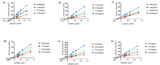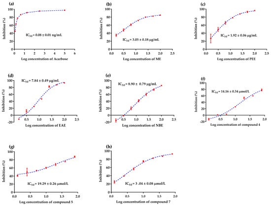 The inhibitory effect on α-glucosidase was measured according to the previous report method with slight modifications [29]. The 20 mM sample dissolved in DMSO was diluted to 50 μM in PBS, 10 μL sample was mixed with 50 μL of 0.1 μ/mL α-glucosidase solution in 0.1 M phosphate buffer (pH 6.5) in a 96-well microplate and 10 μL PBS was used as a blank control. The mixture was incubated at 37 °C for 10 min before adding 40 µL of 5 mM 4-nitrophenyl-α-D-glucopyranoside to each well. After 30 min of incubation at 37 °C, the reaction was terminated by adding 50 μL of 0.1 M Na2CO3 to this mixture. The released 4-nitrophenol absorbance measurements were carried out using a microplate reader (SpectraMax190, USA) at 405 nm. Acarbose was used as the positive control. The enzyme inhibitory activity was expressed as % inhibition and was calculated via the equation: