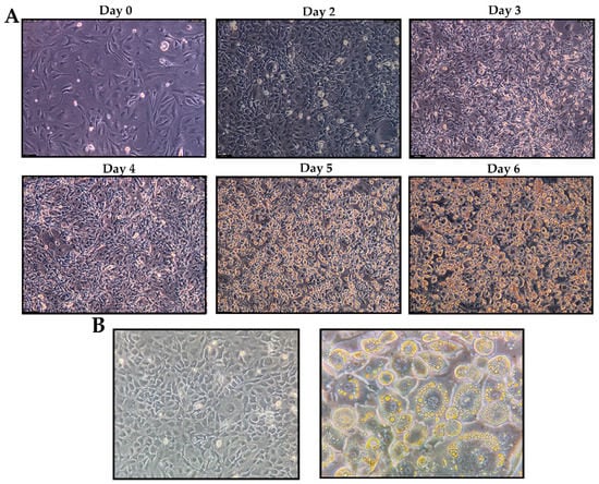Differentiation and identification of 3T3-L1 adipocytes. (A) Differentiation process of 3T3-L1 preadipocytes in the inverted microscope (100×). (B) Differentiation process of 3T3-L1 preadipocytes in the inverted microscope (400×).