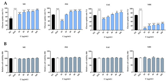 Glucose uptake and cell viability of 3T3-L1 adipocytes treated with T. grandis methanolic extract and fractions. (A) Glucose uptake rates of different groups (ME, PEE, EAE, and NBE). Insulin and berberine were used as positive controls. (B) Cell viability of different groups. All values are mean ± SD from three independent experiments. Significance is denoted by symbols: * p < 0.05, ** p < 0.01, and *** p < 0.001, **** p < 0.0001. ME: methanolic extract, PEE: petroleum ether extract, EAE: EtOAc extract and NBE: n-BuOH extract. NC: blank control group, INS: positive control group, 10–160: sampling group.