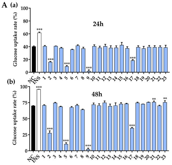 The effects of compounds 1–23 on glucose uptake in 3T3-L1 adipocytes were as follows: As shown in Figure 11A(a,b), the results showed that the glucose uptake rate at 40 μM was positively correlated with time, and the glucose uptake rate at 48 h was higher than that at 24 h. As shown in Figure 11A(b), compounds 21 and 23 could significantly promote the glucose uptake of 3T3-L1 adipocytes at 40 µM (p < 0.01), and the other tested compounds 1–20 and 22 showed no significant promotion effects (p > 0.05). Additionally, compared with the blank control, except for compounds 5 and 9, the positive control group, and all the other tested compounds had no significant effects on the cell viabilities of 3T3-L1 adipocytes (Figure 11B).