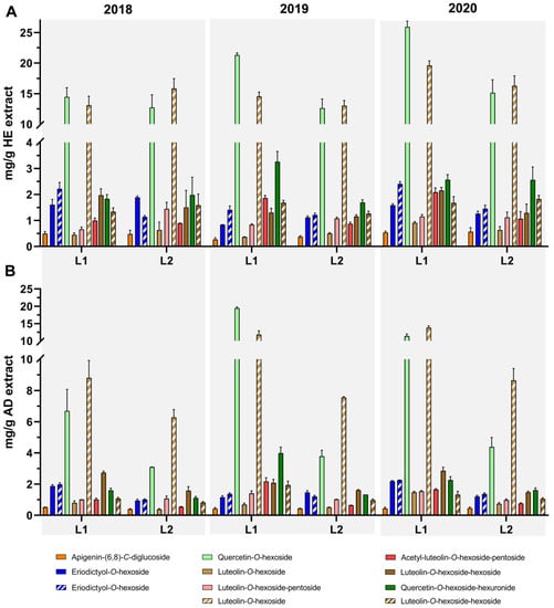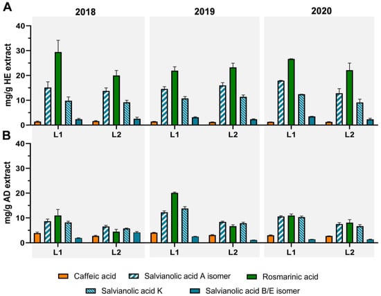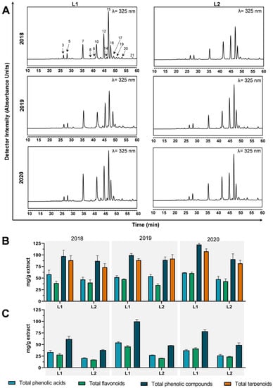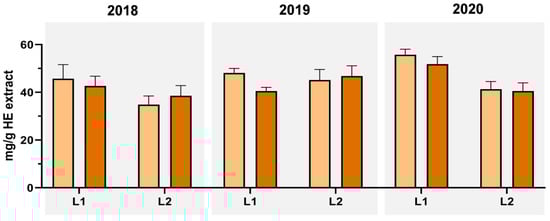 | Year | Loc. | E. M. | Extraction Yield | Total Phenols (mg Caffeic Acid eq./g) | Ortho-Diphenols (mg Caffeic Acid eq./g) | Total Flavonoids (mg Catechin eq./g) | |||