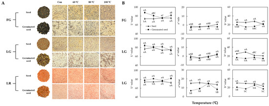 Seed morphology and powder color (A) of seed (nongerminated seed, NGS) and germinated seed (GS) in lentils (FG, LG, and LR) and CIE−color change of the powder (B) during thermal processing. Different lowercase letters indicate the significant differences (Tukey’s studentized test at p < 0.05) between NGS and GS, and capital letters indicates the significant differences (Tukey’s studentized test at p < 0.05) between lentil cultivars treated with different temperatures.