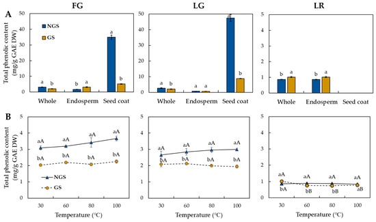 Changes in TPC of (A) different cultivars of lentil whole seeds, seed coat, and endosperm, (B) whole NGS and GS during different thermal treatment. Different lowercase letters indicate the significant differences (Tukey’s studentized test at p < 0.05) between NGS and GS, and capital letters indicates the significant differences (Tukey’s studentized test at p < 0.05) between lentil cultivars treated with different temperatures.