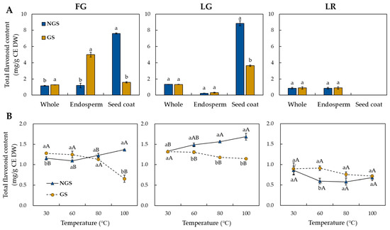 Changes in TFC of (A) different cultivars of lentil NGS and GS in whole, seed coat, and endosperm, (B) whole NGS and GS during different thermal treatment. Different lowercase letters indicate the significant differences (Tukey’s studentized test at p < 0.05) between NGS and GS, and capital letters indicates the significant differences (Tukey’s studentized test at p < 0.05) between lentil cultivars treated with different temperatures.