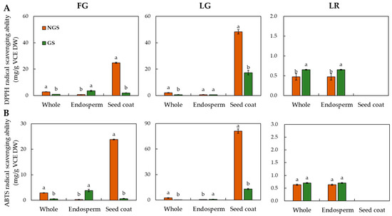 The effects of germination on the DPPH and ABTS radical scavenging abilities in the different cultivars of lentil are shown in Figure 4. It was observed that the DPPH radical scavenging activities varied in the lentil cultivars (Figure 4A). The AA in the whole seeds (with seed coat) of the FG NGS was 2.83 mg/g VCE DW. For the LG NGS, it was 2.13 mg/g VCE DW, which was higher than the DPPH radical scavenging activity observed in the LR (without seed coat) NGS (0.48 mg/g VCE DW). These results were consistent with the ones reported by Lee et al. [34], who stated that lentil cultivars with seed coats exhibit higher DPPH radical scavenging ability than the ones without. The maximum DPPH radical scavenging activities for FG and LG were found in the seed coat and were, respectively, 28.84 and 48.20 mg/g VCE DW. Moreover, similar DPPH radical scavenging activities were observed in both the endosperms and the whole seeds of the NGS of these two lentil cultivars. However, the germination process significantly decreased the DPPH radical scavenging activity in the whole seeds of FG and LG, which were reduced by approximately 64% in the GS in comparison with the NGS. On the other hand, the DPPH radical scavenging activity in the GS from LR was significantly higher than in the NGS. The lower AA of the GS might be caused by a notable drop in the DPPH radical scavenging activity in the seed coat of both the FG and LG cultivars. Additionally, the FG endosperm’s ability to scavenge DPPH radicals was greatly enhanced during germination; however, this was not the case in the LG endosperm. The ABTS radical scavenging ability (Figure 4B) from the NGS of FG, LG, and LR were 2.86, 2.44, and 0.64 mg/g VCE DW, respectively. Similarly to the DPPH radical scavenging ability results, the seed coats exhibited much higher DPPH radical scavenging ability than the endosperms of FG and LG (Figure 4). These results are consistent with the results of numerous studies reporting that seed coats usually exhibit more AA than the endosperms/cotyledons in legume, such as soybean and common bean [26,38]. The germination process also decreased the ABTS radical scavenging ability of the whole seed in FG and LG. The significantly reduced ABTS radical scavenging ability of the seeds coats might be responsible for these results, as the AA of the endosperms were significantly increased (Figure 4B). In crops such as mung bean, soybean, radish, buckwheat, etc., the positive effects of germination on AA have been extensively reported [11,29,30]. The rise in AA during germination is likely related to the quantitative increase in antioxidants such as polyphenols. Nevertheless, it has been reported that the germination process decreased the AA of lentils compared to raw seeds, especially concerning the radical scavenging activities [31]. It is noteworthy that, whereas germination reduced the amount of AA in the seed coat, it provoked a rise in AA in the endosperm. In addition, germination considerably improved the ABTS radical scavenging ability of LG but not of LR, in contrast to the variations of DPPH radical scavenging ability in the endosperm of LG and LR. DPPH radicals tend to react with hydrophobic compounds, while ABTS radicals tend to react with both lipophilic and hydrophilic compounds [39]. Thus, these results might be explained by the antioxidant features and the quantity of GS, which depends on many factors, such as the legume cultivar.