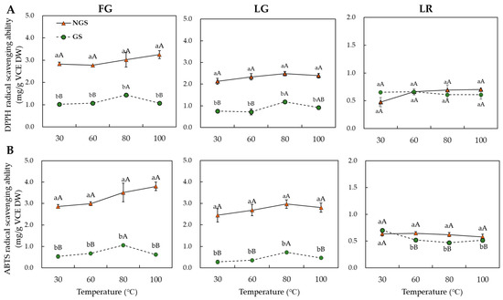 Changes in (A) DPPH, and (B) ABTS radical scavenging activities of different cultivars of lentil NGS and GS during thermal processing. Different lowercase letters indicate significant differences (Tukey’s studentized test at p < 0.05) between NGS and GS, and different capital letters indicate significant differences (Tukey’s studentized test at p < 0.05) between lentils treated at different temperatures.