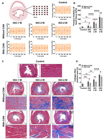 Characterization results of myocardial tissue stiffness and collagen deposition in myocardial fibrosis rats without and with CAN treatment. (A) Stiffness diagrams of tissue samples were obtained based on their Young’s moduli measured by nanoindentation instrument. (B) Statistical histograms of tissue stiffness of fibrotic myocardium (n = 5). (C) Representative Masson’s trichrome staining images of fibrotic myocardium without and with CAN treatment. (D) Statistical histograms of collagen fiber-positive area (%) (n = 5). Data are shown as means ± SEM. ns, no significant difference, * p < 0.05, ** p < 0.01 and **** p < 0.0001 determined by two-way ANOVA.