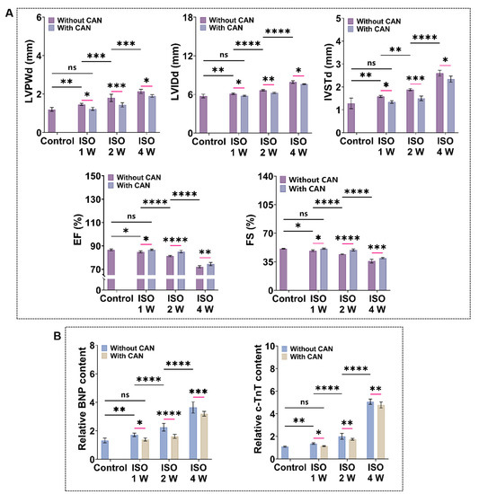 Characterization results of cardiac function and myocardial injury markers in myocardial fibrosis rats without and with CAN treatment. (A) Statistical histogram of echocardiographic statistics of myocardial fibrosis rats without and with CAN treatment (n = 5). (B) Statistical histogram of relative contents of BNP and c-TnT in plasma of myocardial fibrosis rats without and with CAN treatment (n = 5). Data are shown as means ± SEM. ns, no significant difference, * p < 0.05, ** p < 0.01, *** p < 0.001, and **** p < 0.0001 determined by two-way ANOVA.