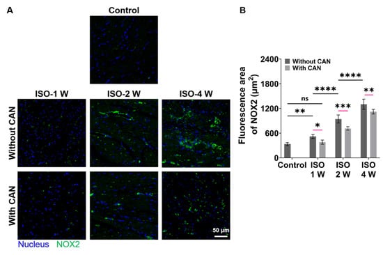 Characterization results of oxidative stress levels in myocardial fibrosis rats without and with CAN treatment. (A) NOX2 fluorescence images of fibrotic myocardium without and with CAN treatment. (B) Statistical histograms of fluorescence area of NOX2 of the fibrotic myocardium (n = 5). Data are shown as means ± SEM. ns, no significant difference, * p < 0.05, ** p < 0.01, *** p < 0.001, and **** p < 0.0001 determined by two-way ANOVA.