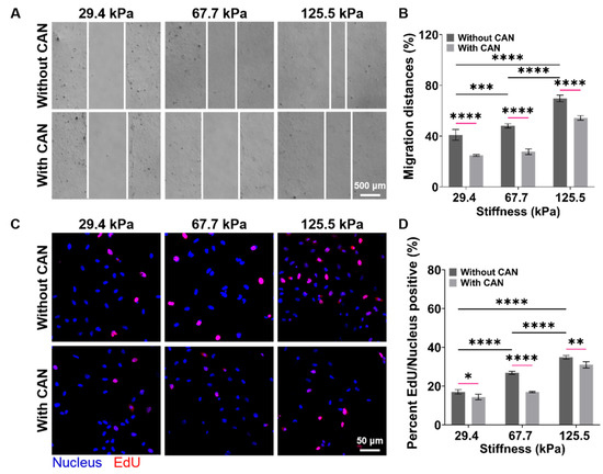 Characterization results of CF migration and proliferation behaviors on the PA gels with a stiffness of 29.4, 67.7, and 125.5 kPa. (A) Migration behavior of CFs on PA gels with different stiffness without and with CAN treatment. (B) Statistical histogram of CF migration rates (n > 3). (C) Fluorescence images of CF EdU/Nucleus rates on PA gels with different stiffness without and with CAN treatment. (D) Statistical histogram of the CF EdU/Nucleus rates (n > 3). Data are shown as means ± SEM. * p < 0.05, ** p < 0.01, *** p < 0.001, and **** p < 0.0001 determined by two-way ANOVA.