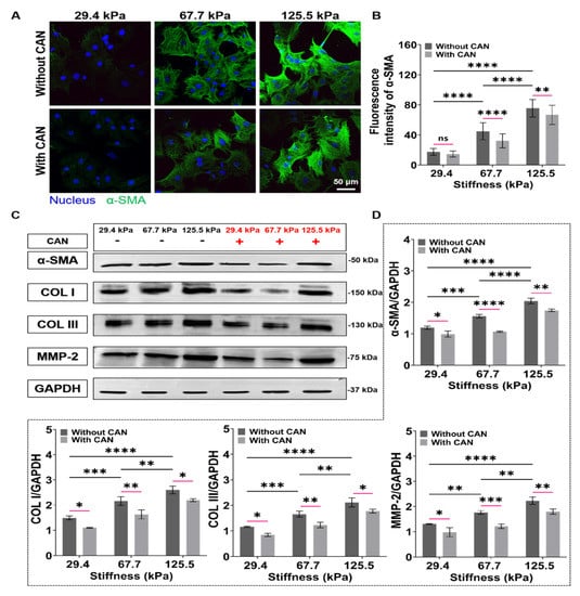 Upon tissue injury, CFs exposed to high strain or ECM stiffness undergo differentiation into myofibroblasts, in which α-SMA is the most used myofibroblast biomarker and represents the activation degree of CFs [34]. From the α-SMA fluorescence images, we observed that the α-SMA expressions of CFs on the PA gels gradually increase with increasing PA gel stiffness. With CAN treatment, the α-SMA expressions decrease (Figure 6A), and CAN shows better inhibition efficiency on the CF activation on the PA gels with 67.7 kPa than those on the 29.4 and 125.5 kPa PA gels (Figure 6B). The activated myofibroblasts are the main source of collagen in the fibrotic heart, causing a significant increase in type I and type III collagens [35]. In addition, MMP2 is also highly expressed in fibrotic tissues, which also leads to excessive collagen deposition in myocardial tissue [36]. We, thus, used western blotting to further characterize the expressions of α-SMA, type I and type III collagens, and MMP2 of the CFs (Figure 6C), which shows that the type I and type III collagens are up-regulated with the increased PA gel stiffness, accompanied with the increased expressions of α-SMA and MMP2. With CAN treatment, the expressions of α-SMA, MMP-2, type I, and type III collagens are all down-regulated. Additionally, according to the statistical analysis of the grey values of α-SMA, MMP-2, type I, and type III collagen with and without CAN treatment (Figure 6D), the decreased degrees of the grey values on the 67.7 kPa PA gels are more obvious than those on the 29.4 and 125.5 kPa PA gels. Based on the results of α-SMA and collagen production-related proteins, we can find that the increased ECM stiffness intensifies the CF activation and the collagen production, and a significant difference in the inhibition of CF activation and collagen production by CAN. It can thus be speculated that the inhibitory effect of CAN on CF activation and collagen production is also affected by ECM stiffness.
