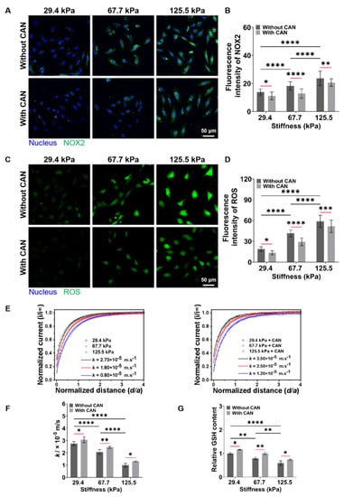 Characterization results of NOX2, ROS, and GSH levels produced from CFs on PA gels with a stiffness of 29.4, 67.7, and 125.5 kPa. (A) NOX2 fluorescence images of CFs on PA gels with different stiffness without and with CAN treatment. (B) Statistical histogram of NOX2 fluorescence intensities expressed by CFs (n > 3). (C) ROS fluorescence images of CFs on PA gels with different stiffness without and with CAN treatment. (D) Statistical histogram of ROS fluorescence intensities expressed by CFs (n > 3). (E) SECM approach curves to CFs on PA gels with different stiffness without and with CAN treatment. (n = 6). (F) Statistical histogram of k values of CFs on PA gels with different stiffness without and with CAN treatment (n = 6). (G) Statistical histogram of relative content of GSH in CFs on PA gels with different stiffness without and with CAN treatment characterized by GSH assay kit (n = 3). Data are shown as means ± SEM. * p < 0.05, ** p < 0.01, *** p < 0.001, and **** p < 0.0001 determined by two-way ANOVA.