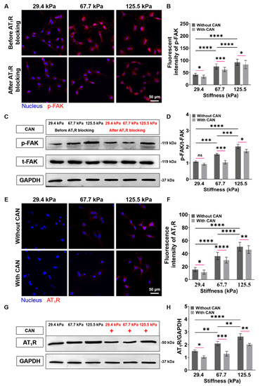 Characterization results of expressions of p-FAK and AT1R of CFs on PA gels with a stiffness of 29.4, 67.7, and 125.5 kPa. (A) p-FAK fluorescence images of CFs on PA gels with different stiffness before and after AT1R blocking. (B) Statistical histogram of p-FAK fluorescence intensities expressed by CFs (n > 3). (C) Relative protein levels of p-FAK of CFs on PA gels with different stiffness before and after AT1R blocking determined by western blotting analysis. (D) Statistical histogram of protein gray values of p-FAK (n = 3). (E) AT1R fluorescence images of CFs on PA gels with different stiffness without and with CAN treatment. (F) Statistical histogram of AT1R fluorescence intensities expressed by CFs (n > 3). (G) Relative protein levels of AT1R of CFs on PA gels with different stiffness without and with CAN treatment determined by western blotting analysis. (H) Statistical histogram of protein gray values of AT1R (n = 3). Data are shown as means ± SEM. ns, no significant difference, * p < 0.05, ** p < 0.01, *** p < 0.001, and **** p < 0.0001 determined by two-way ANOVA.