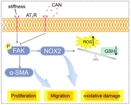 Oxidative stress injury is one of the main features of fibrosis. The elevation of NOX2 and ROS [54] and the reduction of GSH synthesis have been proven in organ fibrosis [55] and cardiovascular disease [56]. Moreover, the GSH efflux regulates the redox state in the extracellular microenvironment and cooperates with the intracellular redox status regulation system to maintain cellular redox homeostasis [57]. Our results confirm that ECM stiffness can directly lead to the accumulation of NOX2, and ROS and the reduction of intracellular and extracellular GSH. It is also noted that CAN has the most obvious antioxidant efficacy under the mechanical condition of medium stiffness. Some studies showed that ECM stiffness can directly activate NOX2 to produce ROS by affecting the cellular microtubule function [58]. Our experimental results also prove that ECM stiffness itself can regulate the expressions of NOX2 and ROS, which is regulated by FAK. Therefore, we consider that ROS changes may also be attributed to the FAK regulation by the ECM stiffness. In addition, the characterization results of GSH in our work show that both the intracellular GSH content and the GSH efflux decrease with the increased ECM stiffness, which is opposite to the change in the ROS level of CFs. Since the consumption of GSH is mainly related to the accumulation of oxidative stress substances inside and outside cells, we can thus speculate that the change trend of the intracellular GSH content and the GSH efflux of CFs may be related to the accumulation of ROS. However, the direct regulation of GSH by ECM stiffness needs further research.