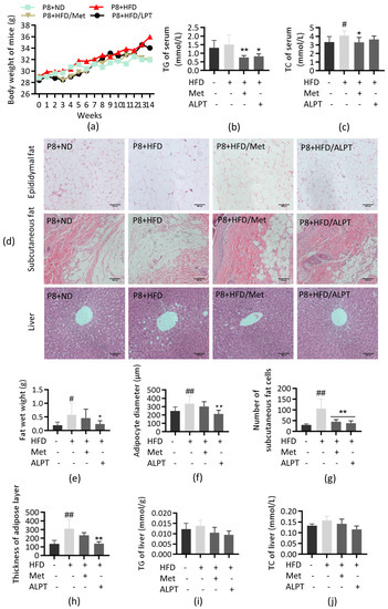 Body weight measurement data showed that mice in the P8+HFD and P8+HFD/ALPT groups had higher body weight after 14 weeks of feeding (Figure 2a). The kit assay results of cholesterol (TC) and triglyceride (TG) showed that the HFD diet significantly increased the levels of serum TC and TG in P8 mice, while ALPT had an inhibitory effect (Figure 2b,c). HE staining showed that in the P8+HFD group, the epididymal adipocytes were hypertrophied (p < 0.05) (Figure 2d–f), the skin structures were disordered, the number of subcutaneous adipocytes and the thickness of the fat layer were significantly increased and the boundaries between subcutaneous muscle and adipocytes were blurred (Figure 2d,g,h). Met and ALPT significantly reduced fat accumulation (p < 0.05 or p < 0.01). In addition, the hepatic sinusoids of P8+HFD group mice were unclear, the cells were arranged disorderly, the nuclei were deeply stained and many fat droplets were accumulated around the manifolds and the contents of TC and TG were significantly increased. In the P8+HFD/ALPT group, the hepatocytes were clear, arranged radially, without inflammatory cell infiltration (Figure 2d), lipid droplets decreased and TC and TG contents decreased (Figure 2i,j).