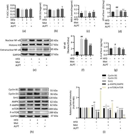 ALPT delays liver aging by anti-inflammatory and metabolic regulation. (a–c) Total antioxidant capacity (T-AOC), superoxide dismutase (SOD) and malondialdehyde (MDA) content assay, n = 5; (d,g) lipopolysaccharide (LPS) and interleukin-6 (IL-6) content assay, n = 5; (e,f) western blotting detection of nuclear transcription factor-kappa B (NF-κB), n = 3; (h,i) western blotting detection of G2/M-specific cyclin B1 (Cyclin B1), G1/S-specific cyclin D1 (Cyclin D1), Sirtuin 1 (Sirt1), Adenosine 5′-monophosphate (AMP)-activated protein kinase (AMPK), mammalian target of rapamycin (mTOR), phospho-adenosine 5′-monophosphate (AMP)-activated protein kinase (p-AMPK) and phospho-mammalian target of rapamycin (p-mTOR), n = 3. # represents compared with P8+ND group, p < 0.05, ## represents compared with P8+ND group, p < 0.01, * represents compared with P8+HFD group, p < 0.05, ** represents compared with P8+HFD group, p < 0.01.