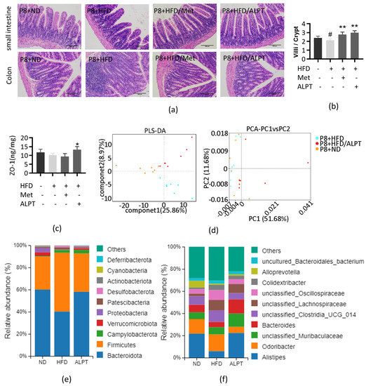 The composition of the intestinal microbiota was compared through β-diversity analysis. The principal coordinate analysis (PCA) and partial least squares discriminant analysis (PLS-DA) showed that the P8+HFD/ALPT group was far away from the P8+HFD group and close to the P8+ND group. The results showed that ALPT could inhibit P8+HFD-induced changes in intestinal flora composition (Figure 5d).