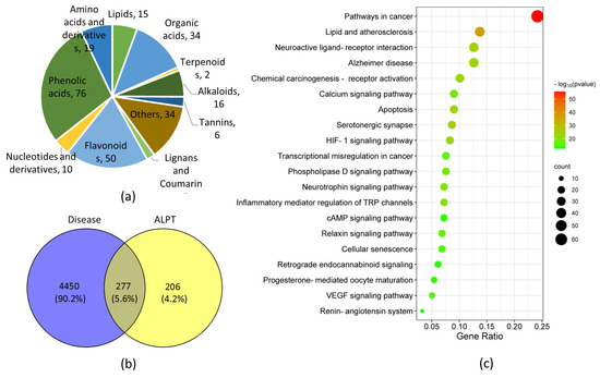 Widely targeted metabolomics of ALPT aqueous extract and their network pharmacological analysis. (a) Classification diagram of metabolites of ALPT aqueous extract; The numbers in the pie chart represent the number of metabolites. (b) Venn analysis was used to screen the target genes of ALPT water extract metabolites delaying degenerative changes; (c) KEGG analysis of target genes of ALPT water extract metabolites delaying degenerative changes.