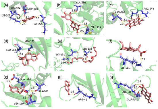 Docking conformation of five key target proteins and their combined components. (a) SRC to 5,7-Dihydroxy-1(3H)-isobenzofuranone. The binding energy is −3.481. (b) SRC to dihydromyricetin. The binding energy is −2.17. (c) SRC to ellagic acid. The binding energy is −3.47. (d) TP53 to pimaric acid. The binding energy is −5.83. (e) MAPK3 to 9,10-Dihydroxy-12,13-epoxyoctadecanoic acid. The binding energy is −0.47. (f) MAPK3 to pimaric acid. The binding energy is −5.47. (g) HSP90AA1 to L-tyrosine. The binding energy is −3.76. (h) AKT1 to 7-hydroxycoumarin. The binding energy is −5.28. (i) AKT1 to ellagic acid. The binding energy is −5.17.